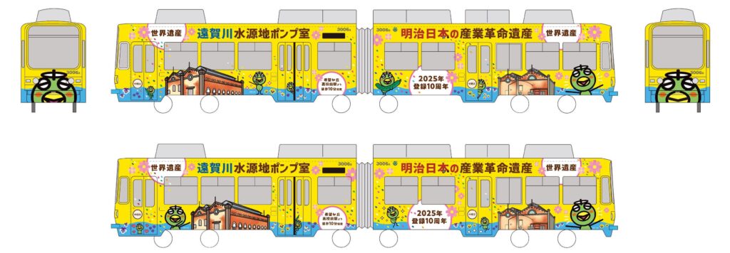 これを記念し、遠賀川水源地ポンプ室の最寄りの交通機関である筑豊電気鉄道にて、「世界遺産10周年記念ラッピング電車」の運行を開始しました。